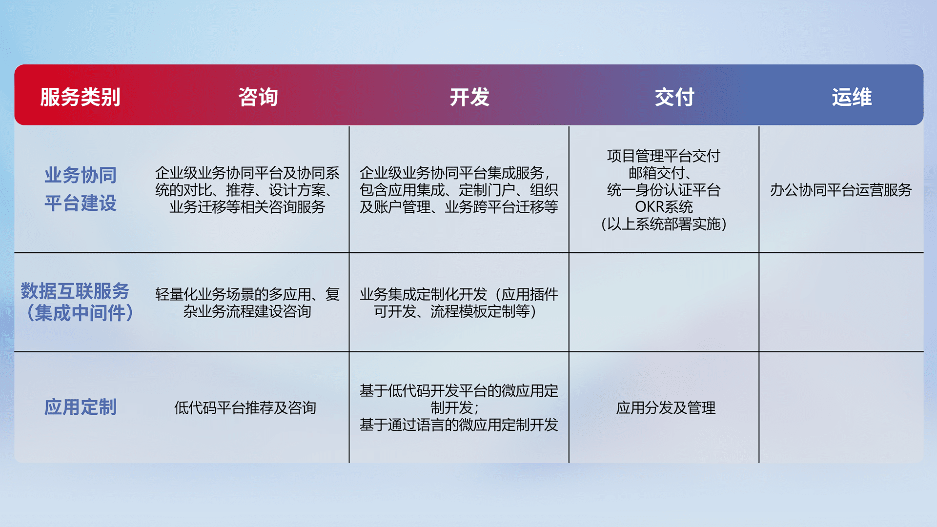 针对钉钉、、企微、、、IDaas等平台级产品提供产品的规划、、、、方案、、、、交付、、定制化开发等服务,,,实现如统一协同办公、、、智能客户服务、、混合会议管理、、、智能数据查询、、等业务场景,,,实现数字化转型。。。。